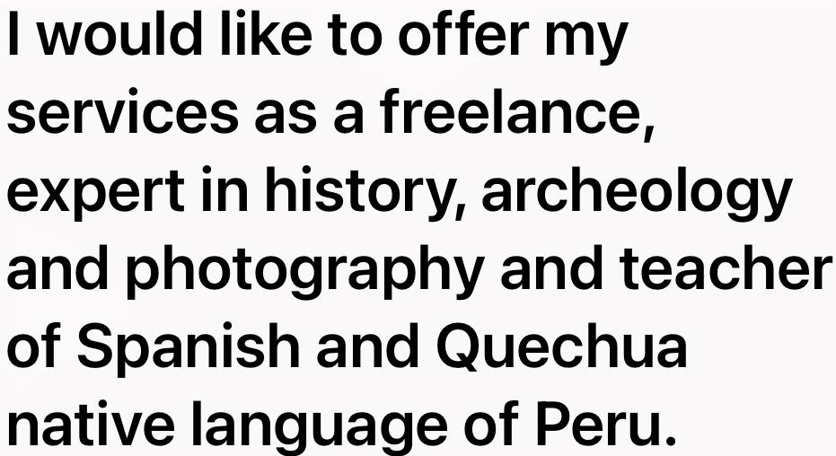 I would like to offer my services as a freelance, expert in history, archeology and photography and teacher of Spanish and Quechua native language of Peru.